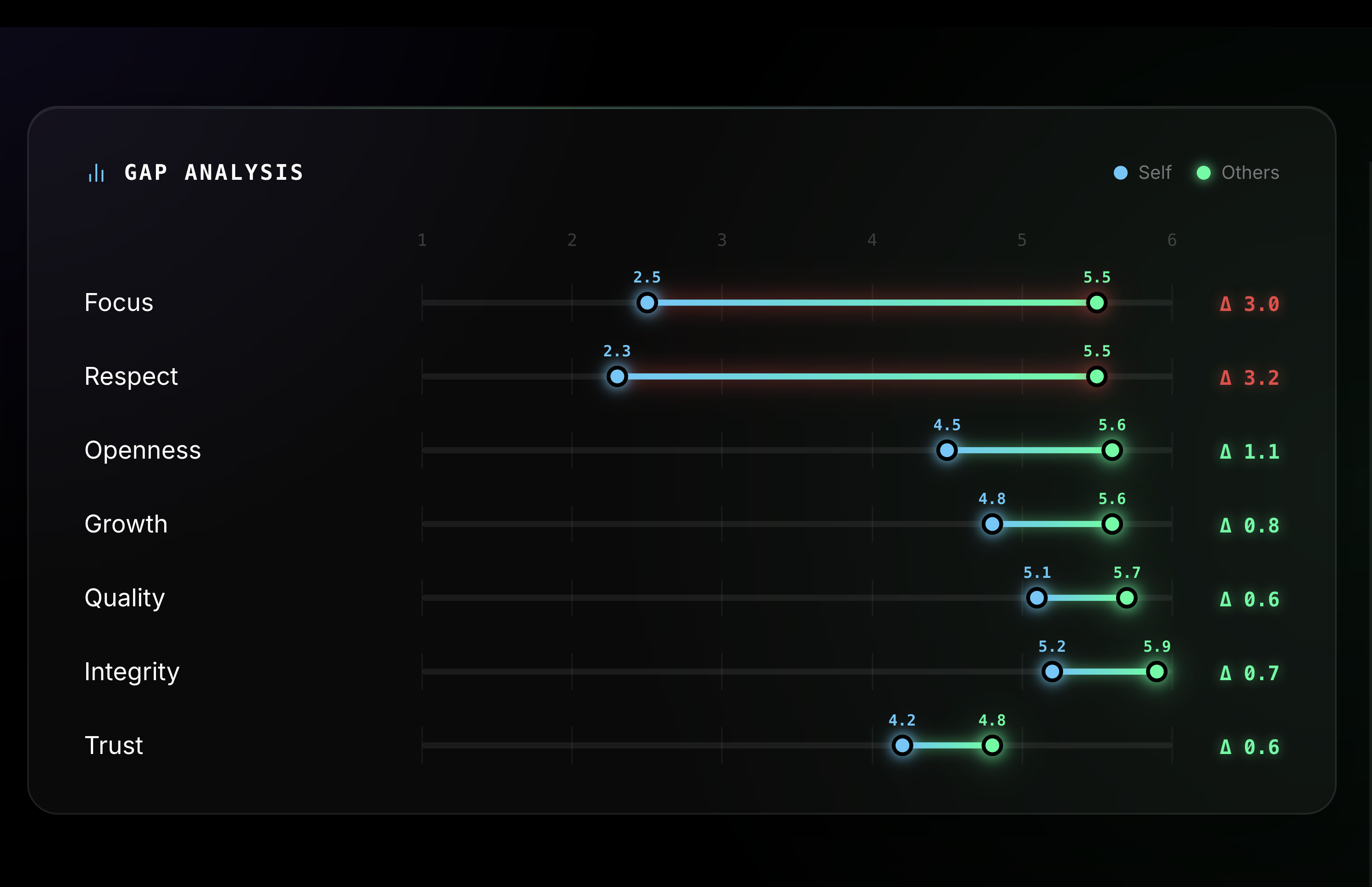 See where you overestimate yourself. See where you underestimate yourself. The dashboard stays locked until five responses come in, and scores only update in batches of three, so no answer is traceable to one person.