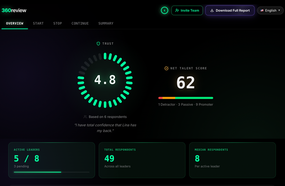 Your team gets a private link. No accounts. No passwords. No app to install. They rate you on the same metrics and provide specific feedback through the Start-Stop-Continue framework. Five minutes. That's all you're asking of them. Available in 12 languages.