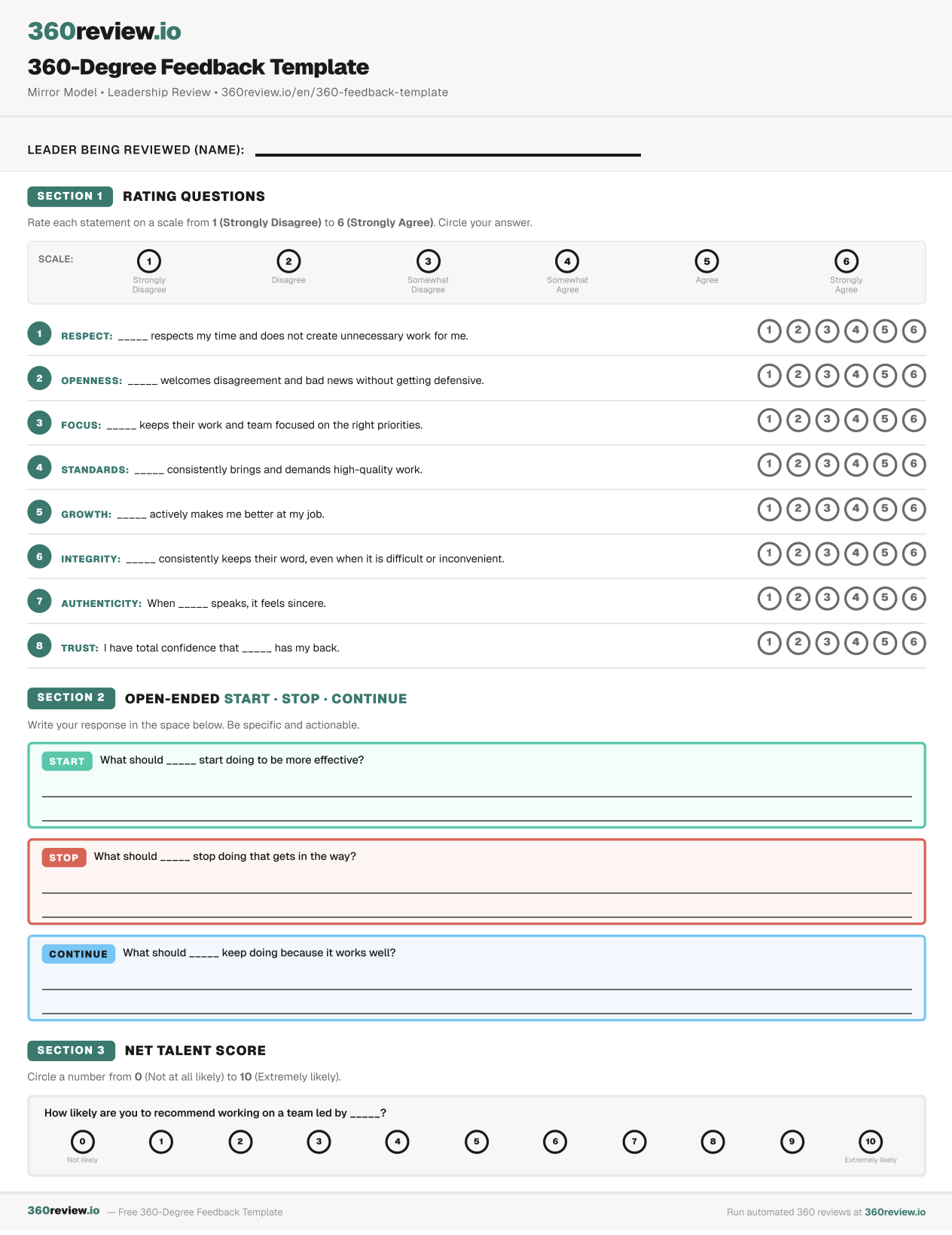360review.io does all of this automatically. Your team rates you in 5 minutes. Anonymity is enforced. Results are aggregated into an AI-powered report with a 90-day action plan. And it costs less than the time you would spend building the template yourself.